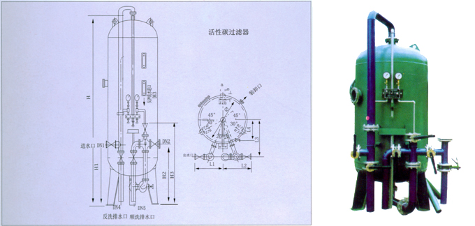 本過濾器其工作狀態為壓力式,柱內裝粒狀活性碳,裝填厚度一般為1000~2000毫米,柱體材質為Q235或不銹鋼。