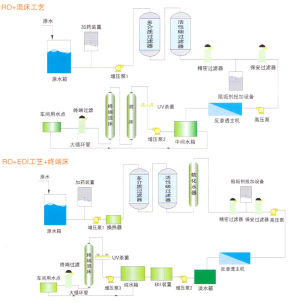 電子工業、稀土工業及其他需高純水的場合.對純水的電導率、PH值、離子含量均有很高的要求。RO—C高純水系統專為制取高純水而設計。它有予處理部分、RO部分、混床(或EDI)、精混床(或拋光混床)、大循環系統構成.出水水質電阻率可達1 6—1 8M Q-cm。